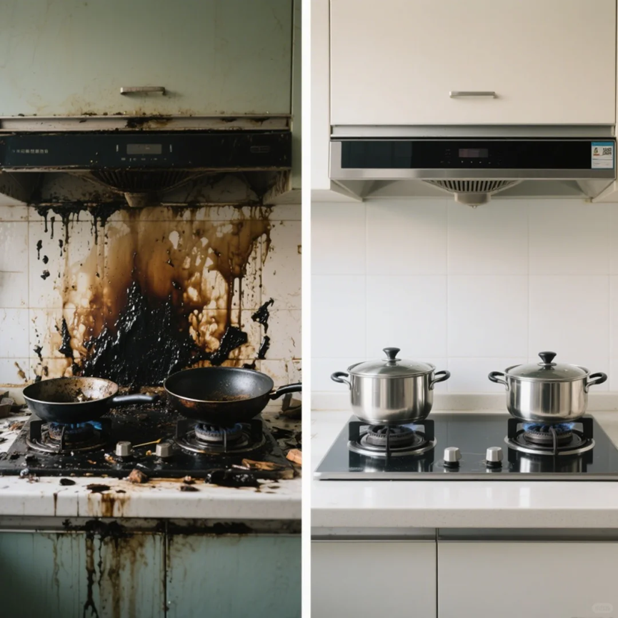 平时家里炒菜做饭的时候都会产生很多的油烟,厨房的油烟机以及台面上都有一些残留的油污。
