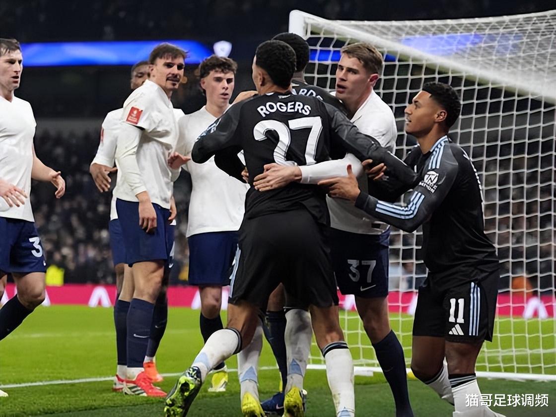 终场哨响,火药味瞬间升级。沃特金斯在若昂·帕利尼亚面前激情庆祝,直接导致后者与罗杰斯、埃兹里·孔萨爆发口角,双方球员迅速聚集,场面一度失控。