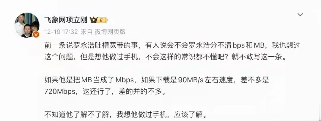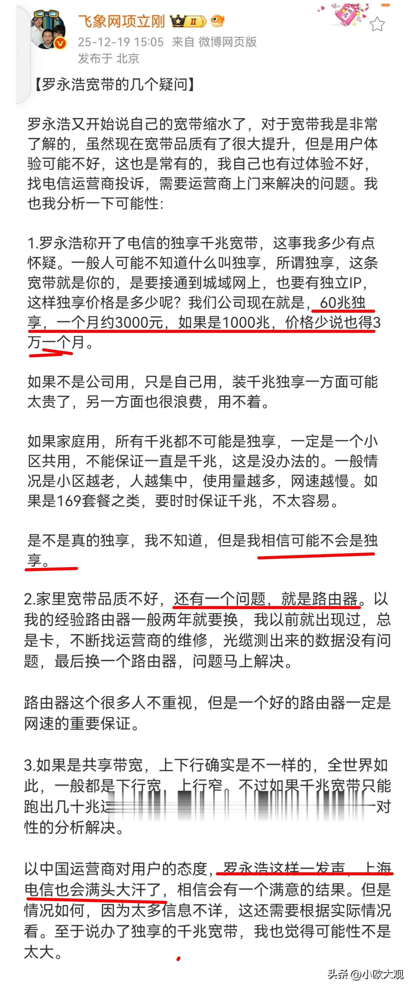 看到罗永浩吐槽宽带这件事在网上一直发酵,项立刚作为这个通信业的行家坐不住了。