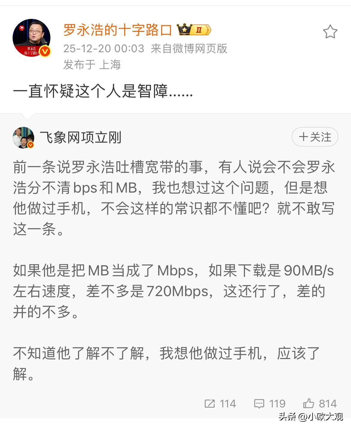 有网友看了项立刚的发文后,留言评论质疑罗永浩分不清bps和MB(我是不知道)