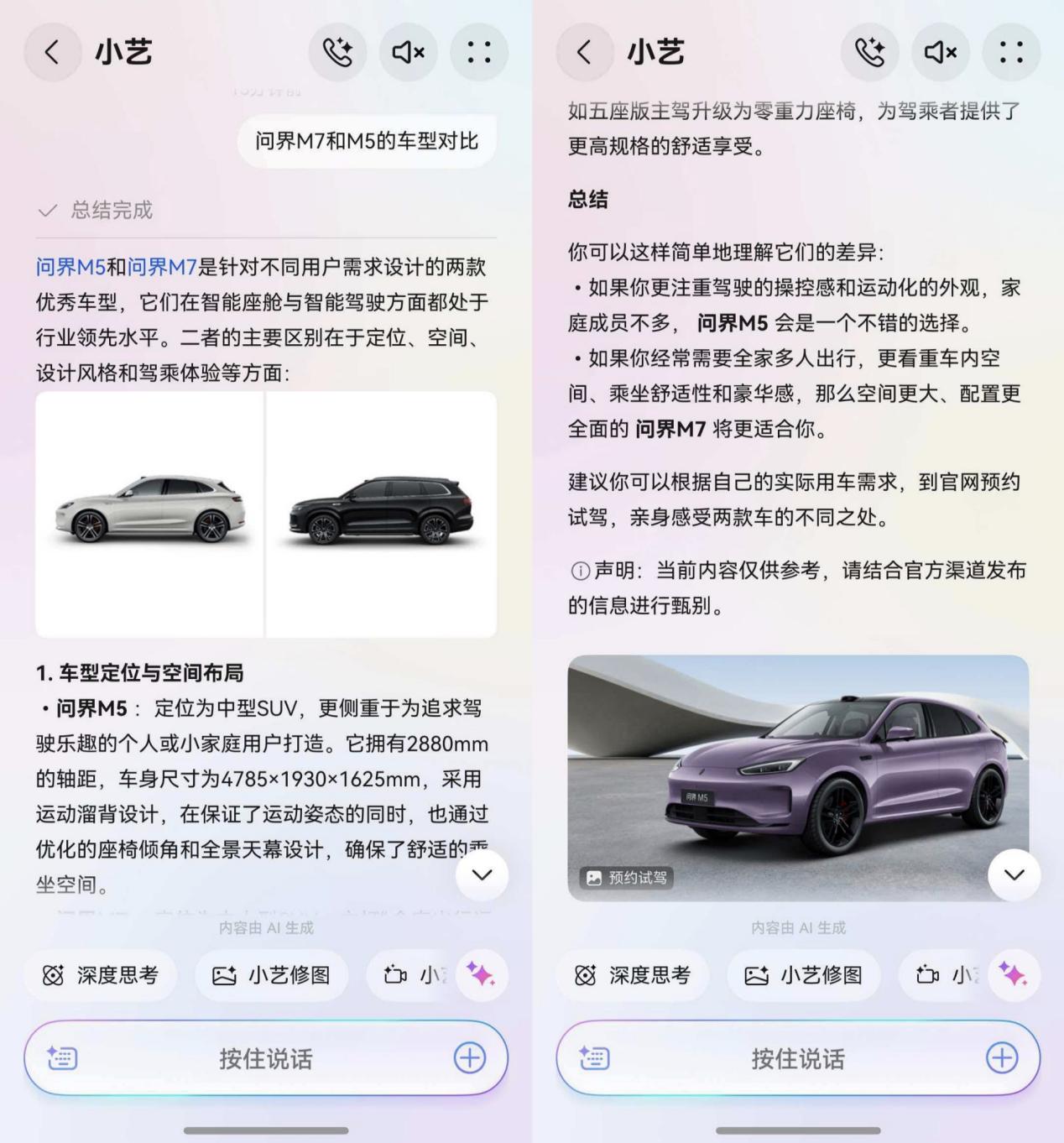 看完视频我就在想,这不就是我们梦寐以求的高效工作吗?其实小艺的玩法很多,TA的潜力完全取决于你的想象力。比如小艺时光机,授权后,可以自动整理用户日常的运动、拍照、听歌、去过的地方、通话记录等信息,帮你随时回顾生活中的精彩时刻。还有小艺问答,正好家里车用了好多年该换新,对小艺说了句“问界M7和M5的车型对比”,它就像精通汽车的知识专家一样,给出专业解答,所有参数一目了然,可比我自己去翻网页方便多了。