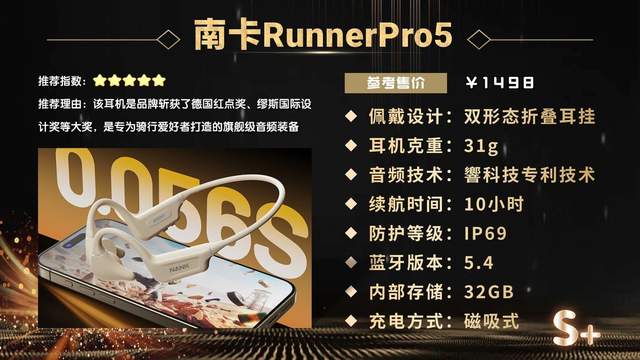 南卡RunnerPro5是品牌做了十几年骨传导后推出的真正旗舰款,拿过德国红点奖、缪斯国际设计奖,还是尼日利亚驻华大使馆指定用品,专门给骑行爱好者打造,在抗风噪和安全听音这块做得特别专业。