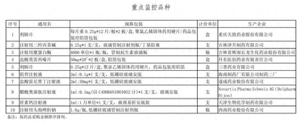 2024年4月开始,上海阳光医药采购网每月发布重点监控品种名单,截至目前官网已发布22个月的名单。据新京报记者统计,重庆天致药业、三普制药的两款利肺片,吉林津升药业的注射用二羟丙茶碱,海南制药厂有限公司第二制药厂的肌苷注射液,从第一期名单发布开始,便榜上有名。该名单按药品采购金额降序排列,重庆天致药业的利肺片始终高举首位,遂成药业的盐酸雷尼替丁注射液、石岐制药的环磷腺苷注射液、辉南长龙生化药业的注射用糜蛋白酶等药品也是重点监控名单中的“常客”。
