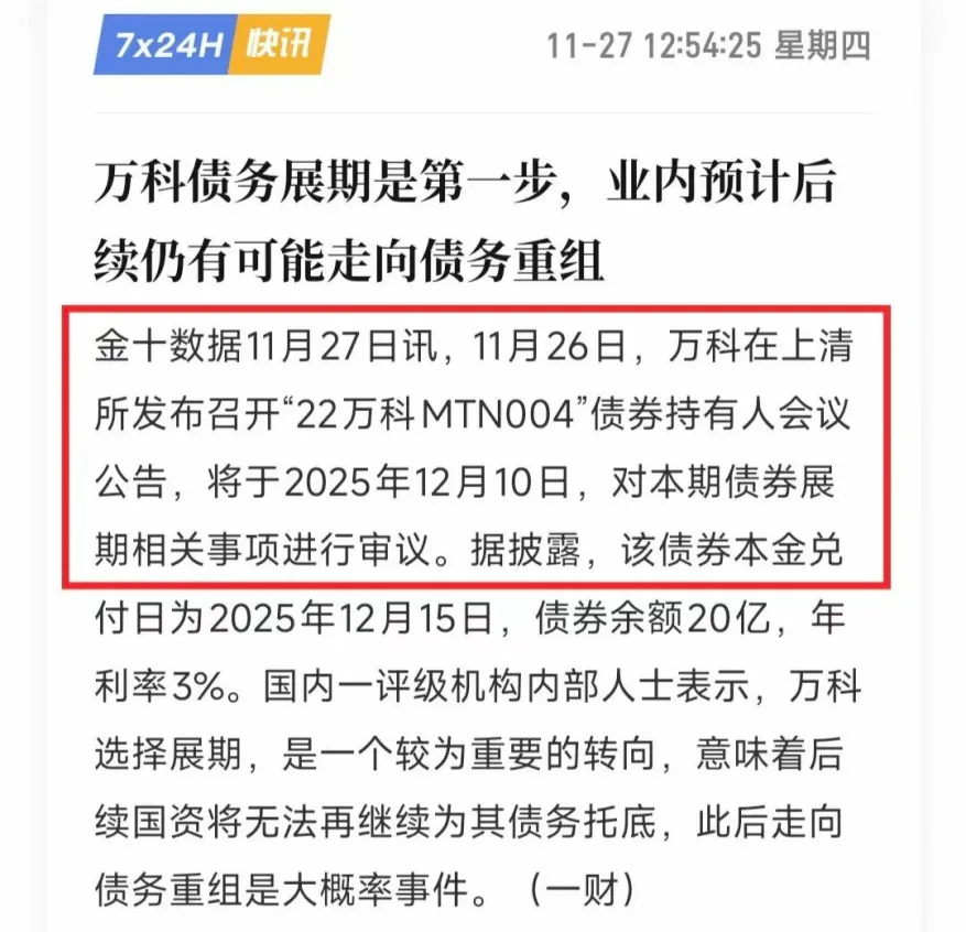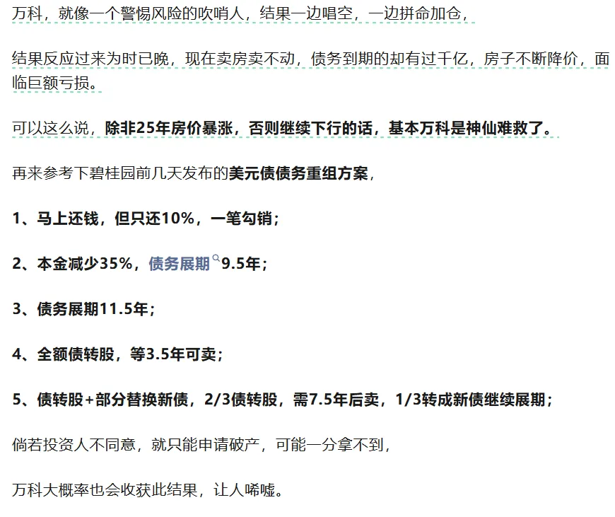 第二,万科最终结局就是债务重组,方案类似于碧桂园,要么拿回极少的本金,一笔勾销,要么债转股,要么债务直接展期,