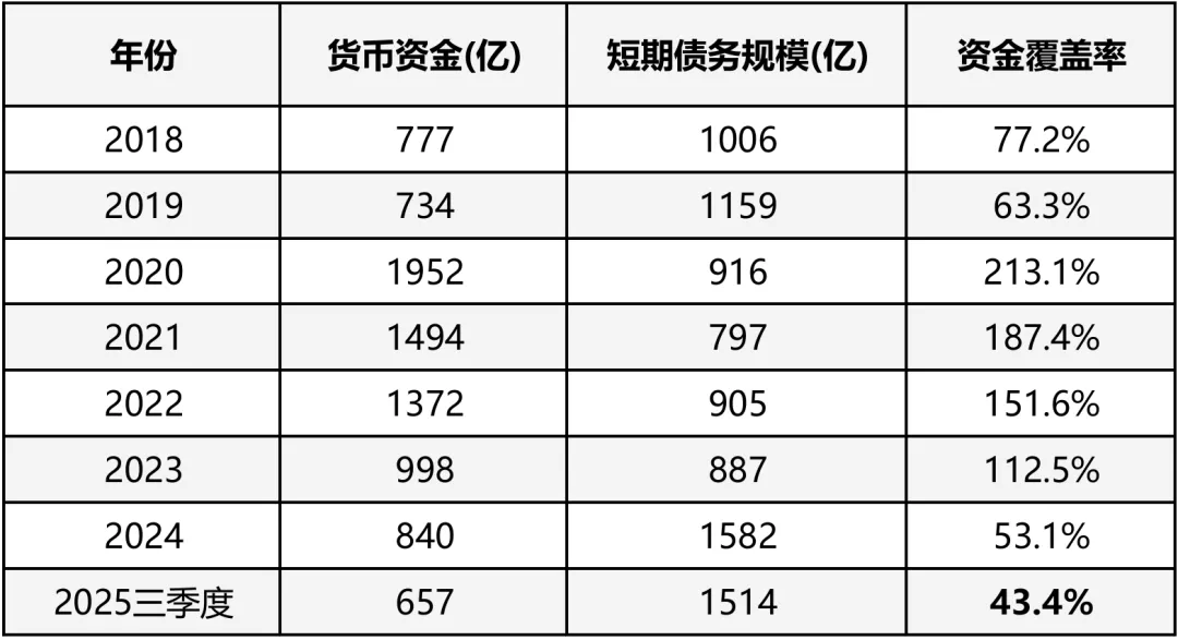 截止25年三季度,万科账上仍有657亿现金,但其中大部分是用于保交付的监管账户资金,能调用的现金只有几十亿,而短期债务规模却高达1500亿,