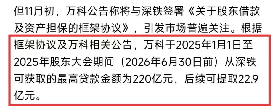 所以深铁就跟万科签了个协议,万科可以从深铁那贷款220亿,解燃眉之急,