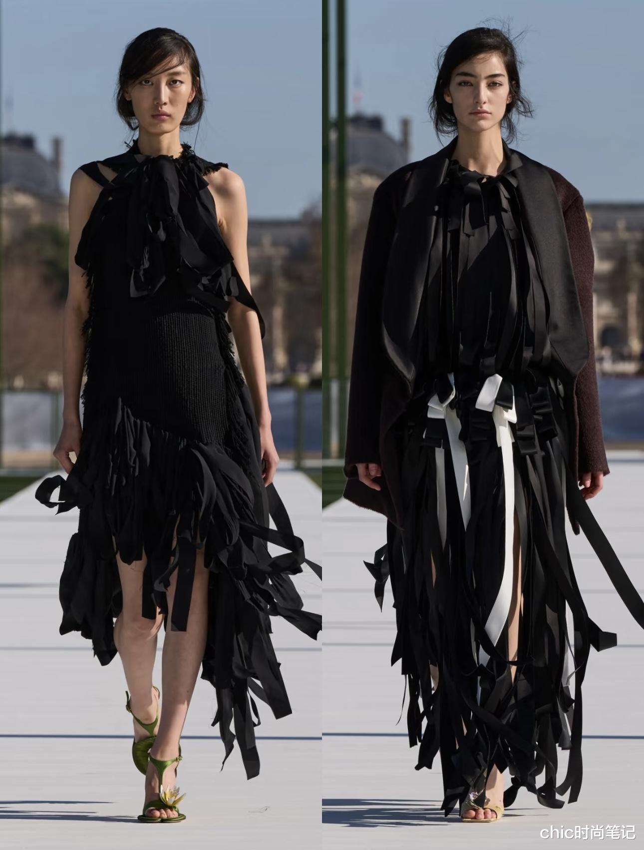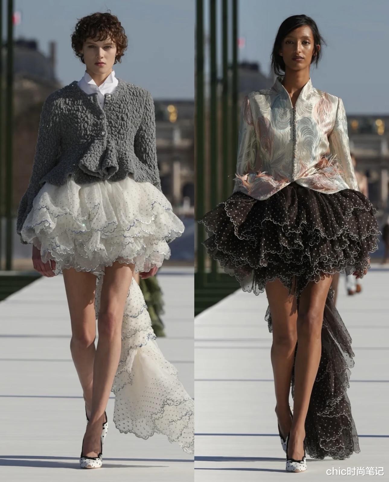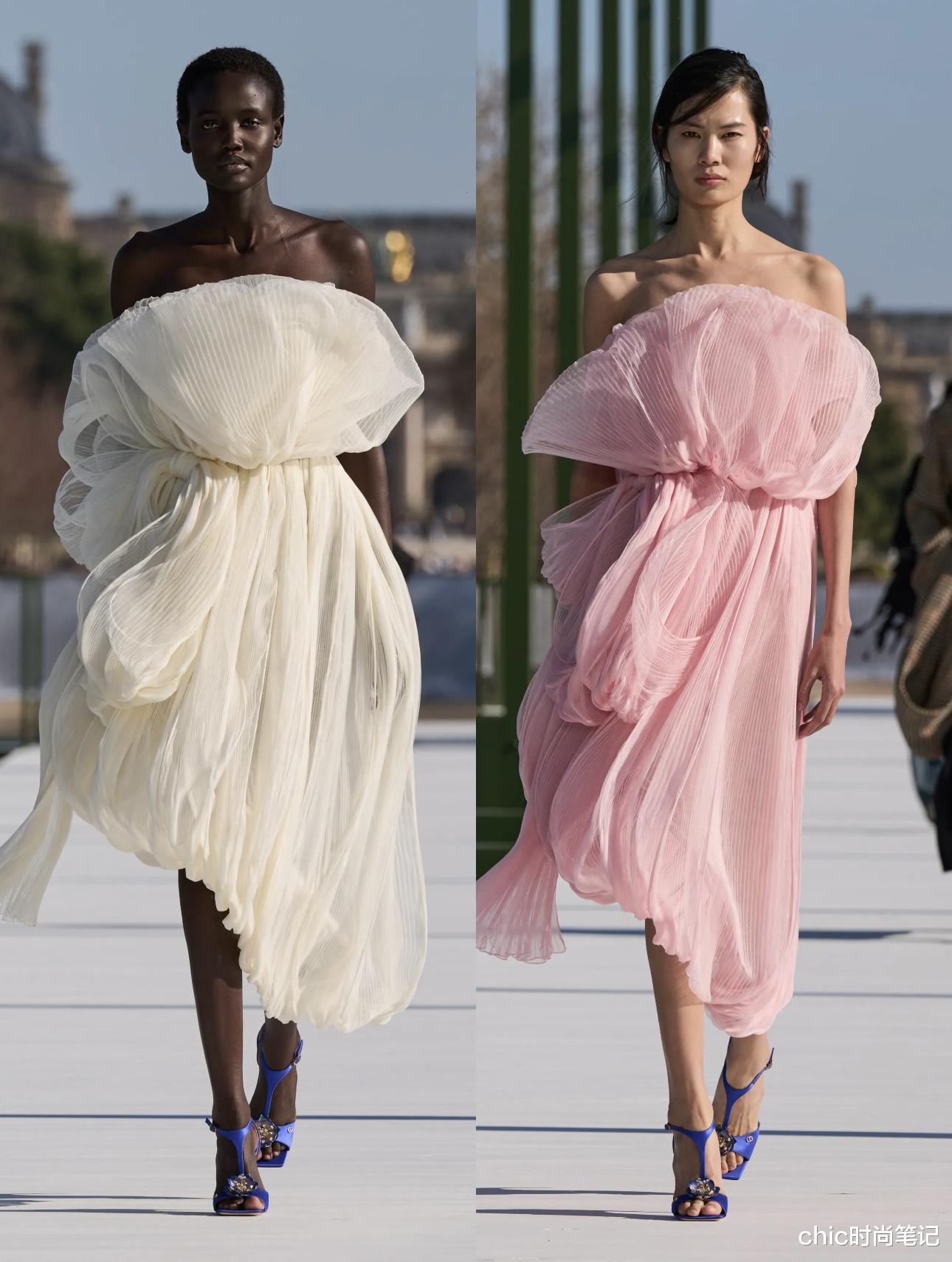 两件温柔系的柔纱裙有几分高定系列的身影,用不同面料的纱设计成不规则的裙子,胸口与下摆处的衔接又自然又高级,满满的治愈系。