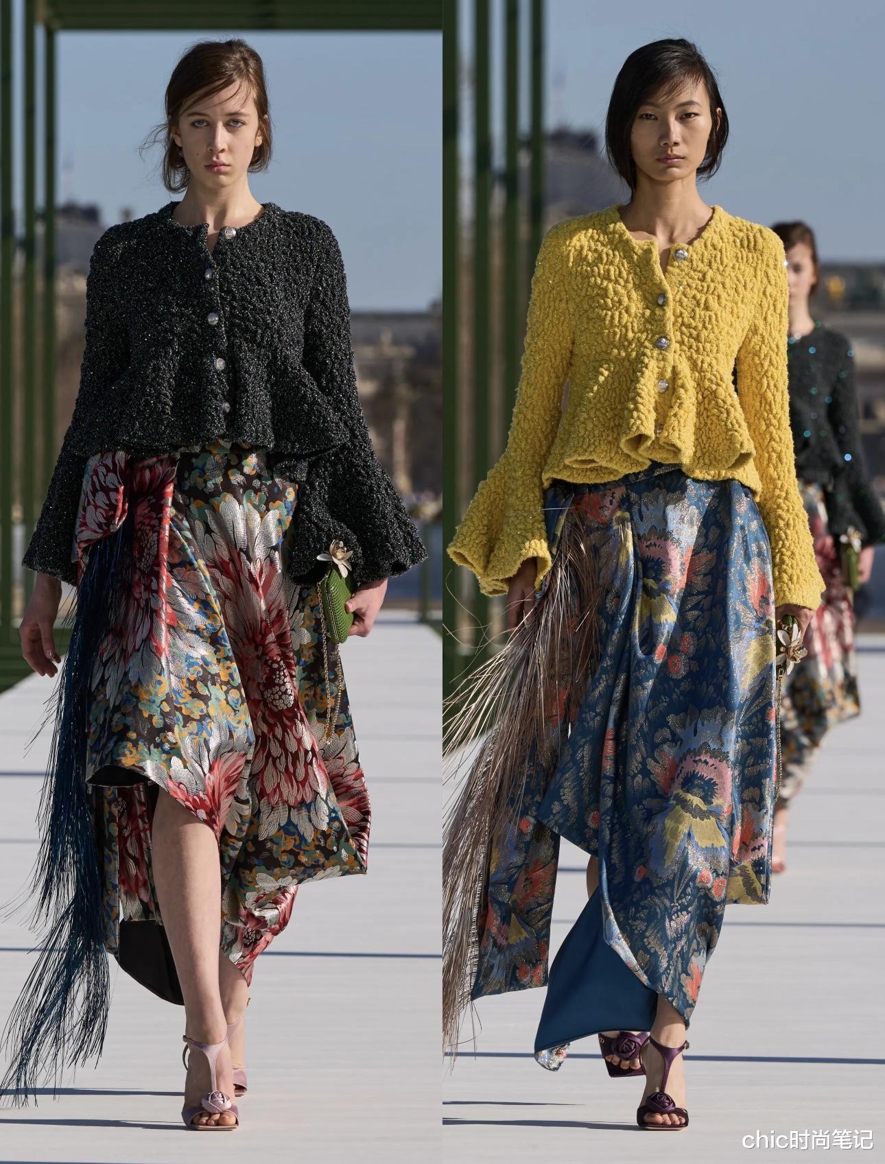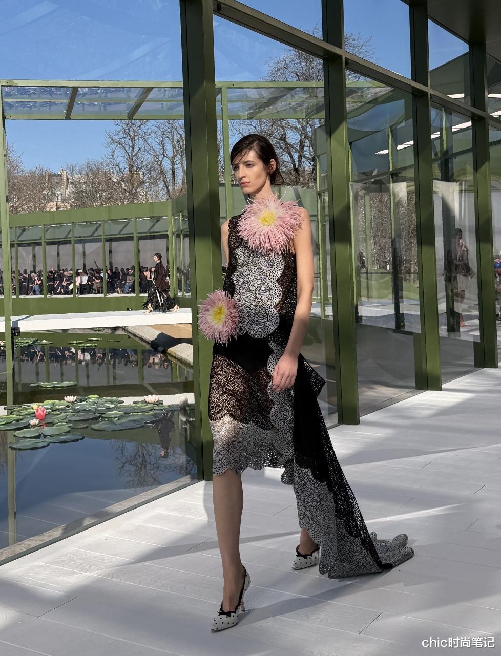 本次大秀主题是跟睡莲有关,大面积睡莲印花图案长裙设计成不规则开叉裙,柔美的翘边搭配,把个性与时尚有效结合在一起。