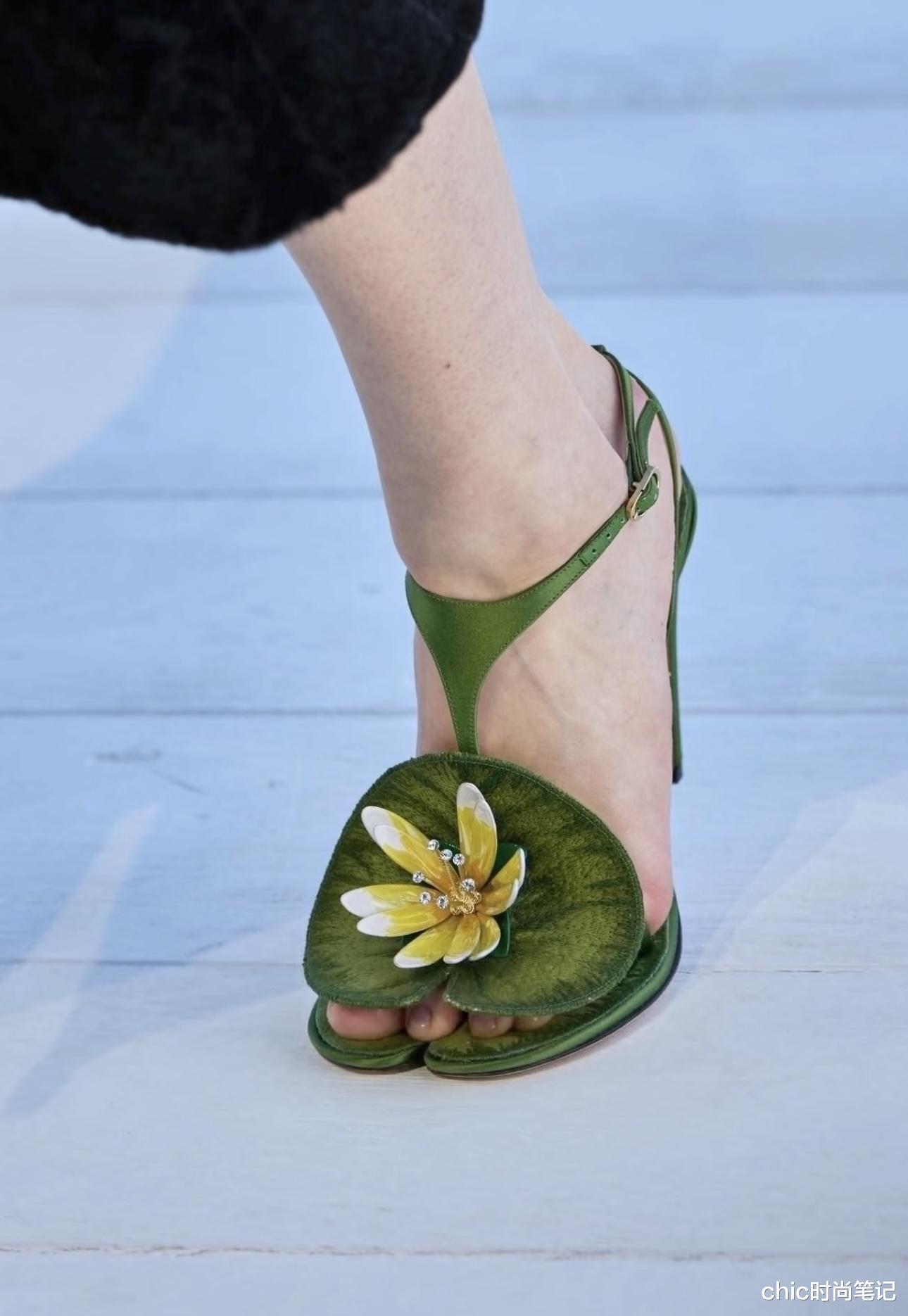 高跟鞋的设计也极具创意与个性,睡莲作为高跟鞋头点缀,带着大自然的松弛气息,把治愈系轻松玩转。