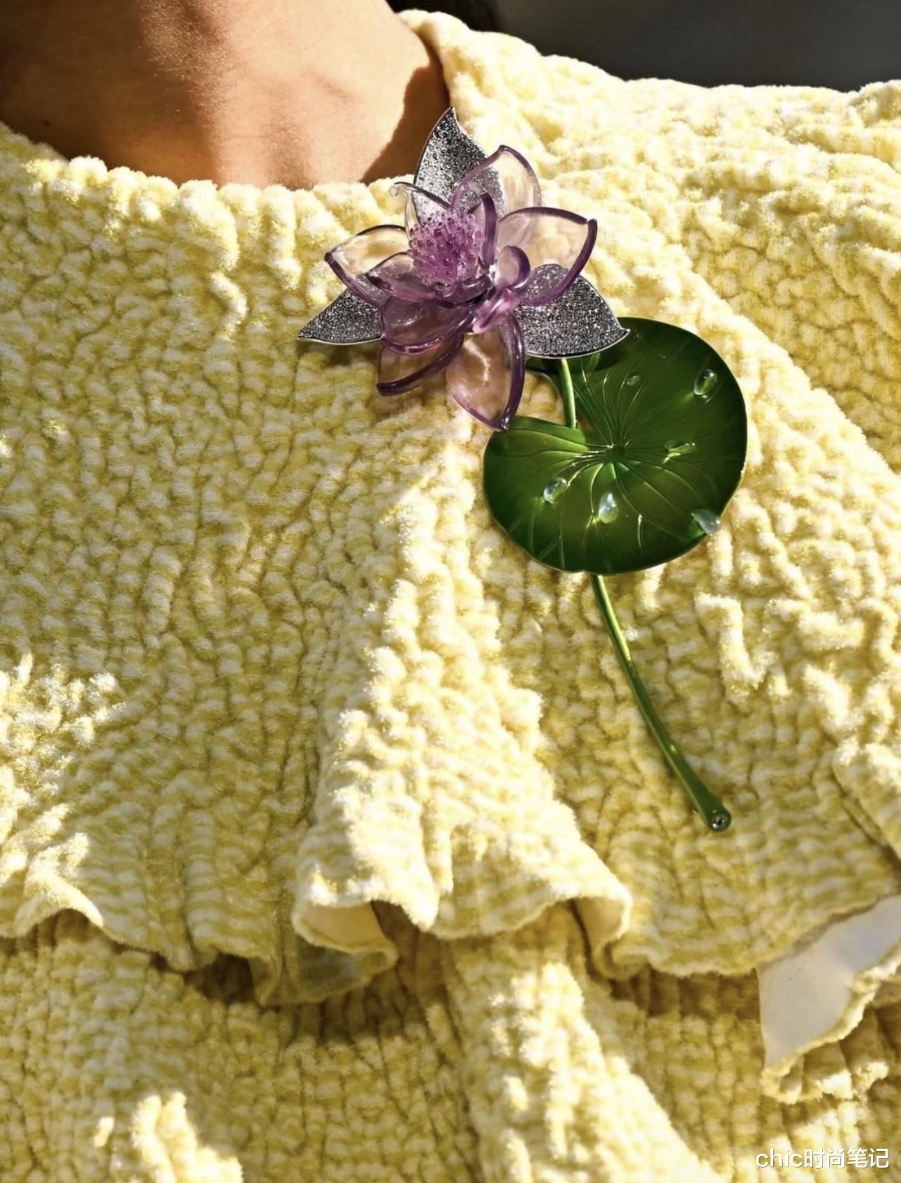 把荷叶和睡莲设计成胸针款式,让原本简约的服装变得细节和高级起来,粉绿的经典睡莲配色清新和时尚度up!