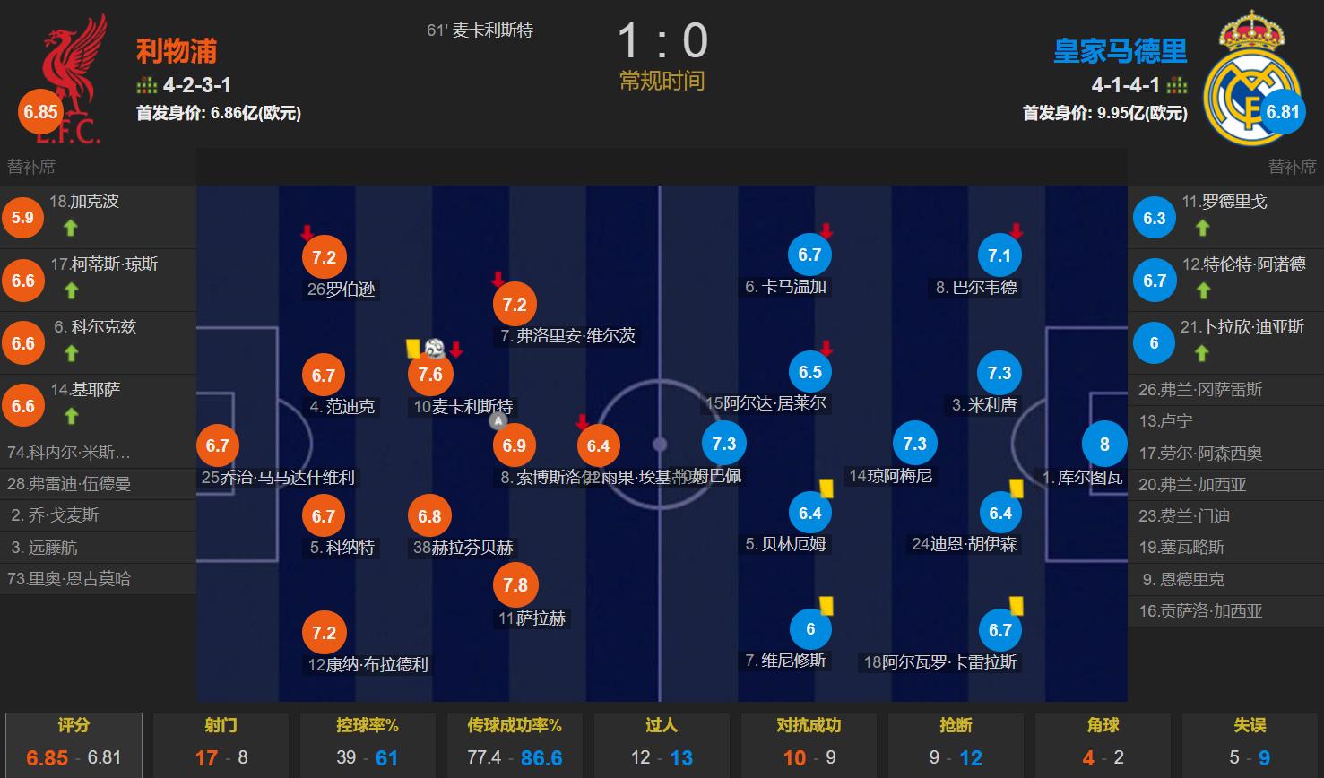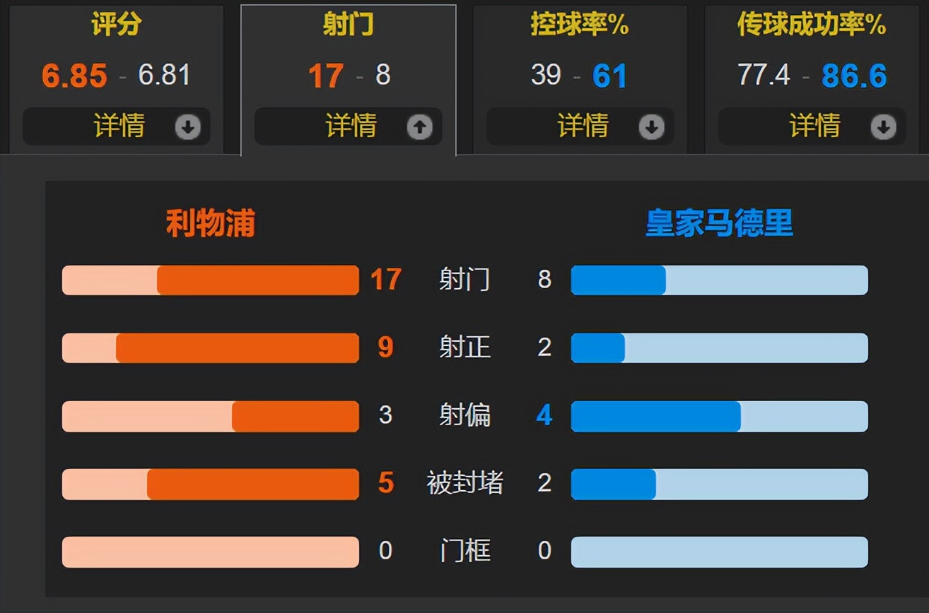 比赛数据进一步说明了此役利物浦碾压皇马,利物浦的控球率仅为39%,但有17次射门,比皇马的2倍还要多1次;射正比更是9-2。利物浦赢球的比赛,全场最高分是皇马门将库尔图瓦(8分),这足以说明此役的比赛局势。皇马进攻端,贝林厄姆和维尼修斯状态非常低迷,姆巴佩独木难支。皇马输给利物浦遭遇欧冠赛季首败,也给阿隆索上了一课。