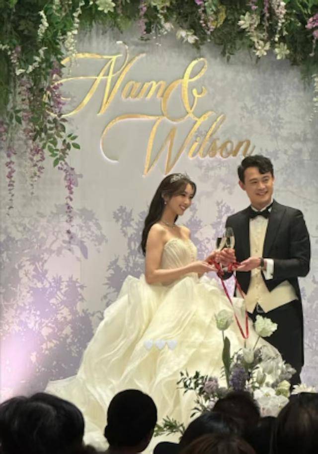 黄静蓝手挽着身为餐饮集团执行董事的老公Wilson进场接受宾客们的祝福,二人在台上向一众宾客祝酒,场面很是温馨感人。