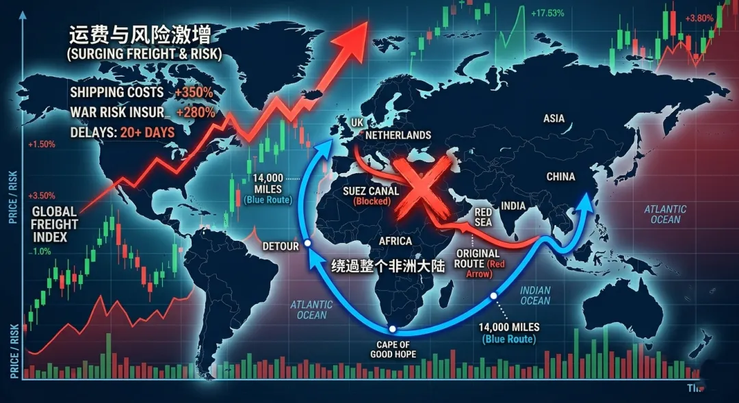 现在的外贸出口面临着史无前例的“烧钱游戏”:1. 运费暴涨: 以前一个柜子到红海吉达港只要2200美金,现在飙升到7000美金。2. 战争附加费: 哪怕能运,还得额外加1500到3000美金的保险与附加费。3. 绕行成本: 由于航道关闭,货船不得不绕行非洲好望角,航程翻倍,成本激增。
