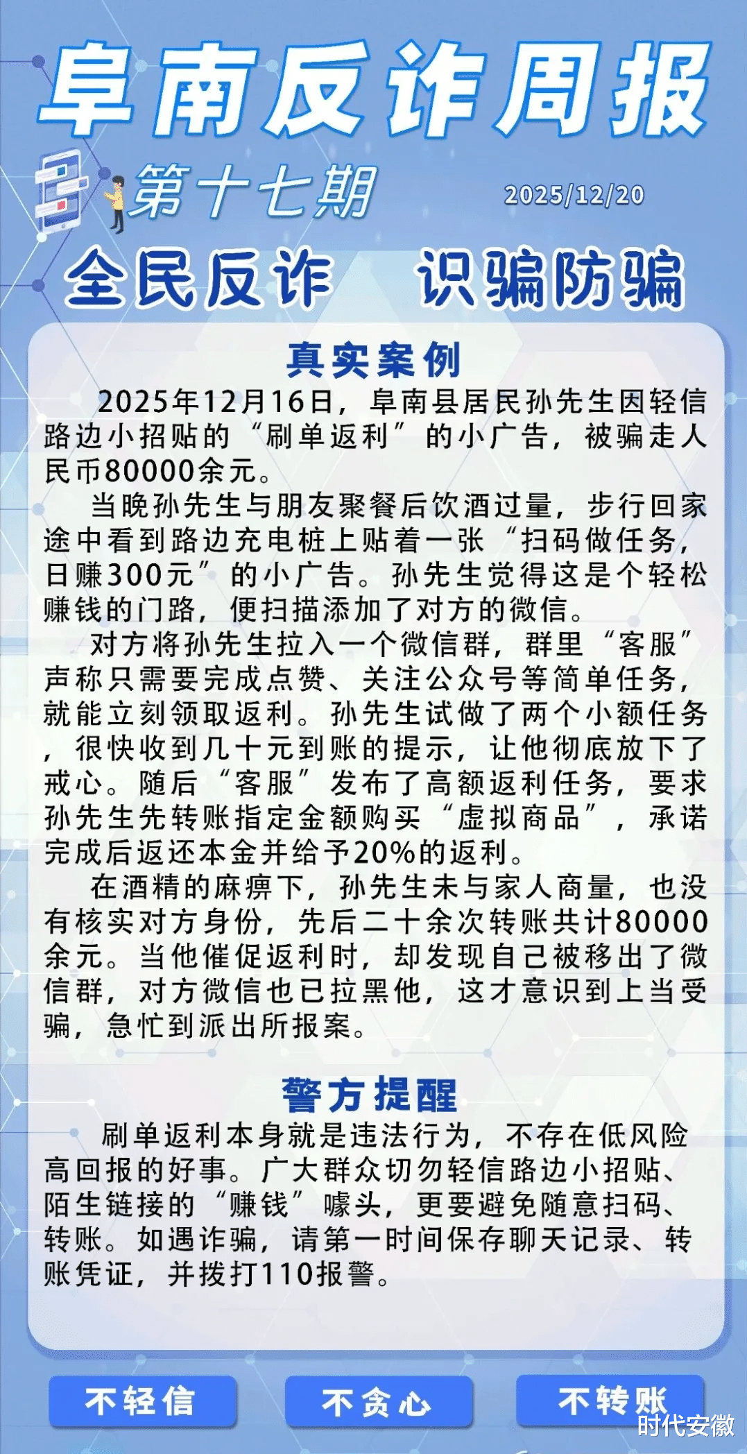 2025年12月16日,阜南县居民孙先生因轻信路边小招贴的“刷单返利”的小广告,被骗走人民币80000余元。