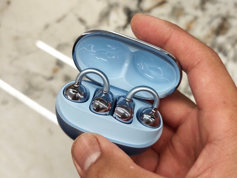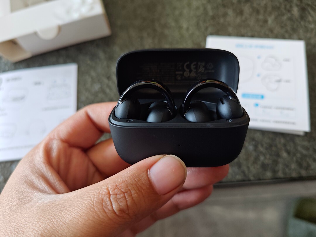 韶音OpenDots One在佩戴上采用C形桥设计,机身重量只有5克左右,夹在耳朵上很轻盈,硅胶材质触感亲肤,长时间戴着也不会觉得累。不过这种结构对耳廓形状有点挑剔,耳朵小的人可能会感觉夹不紧,稍微动一动就容易松。
