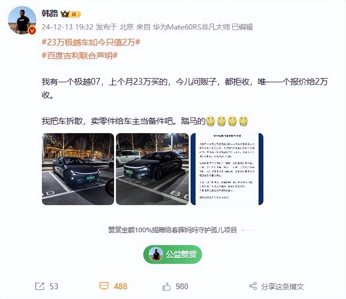 韩路的经历反映了许多极越车主当前的困境,他们面临着如何处理这辆价值大幅缩水的车辆的问题。