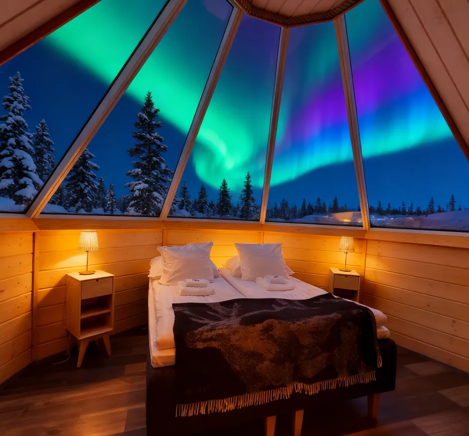 可升级玻璃屋:升级北极光度假村玻璃屋,所有玻璃屋内均设有加热天窗,迷你酒吧,热水器,吹风机,独立卫浴以及无线网络连接,您要做的就是躺在床上等极光降临(详询客服)