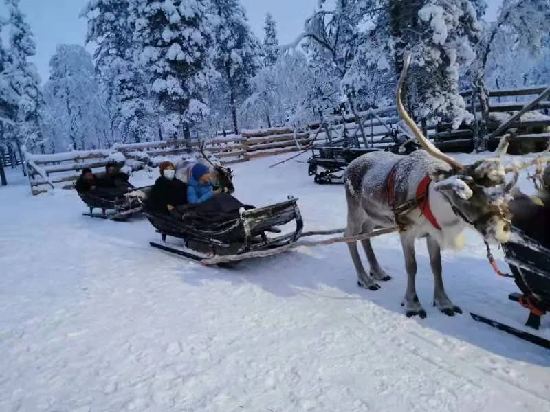 驯鹿雪橇漫游:化身圣诞电影主角,乘坐驯鹿雪橇穿越白雪森林,听饲养员讲述拉普兰人的生存智慧
