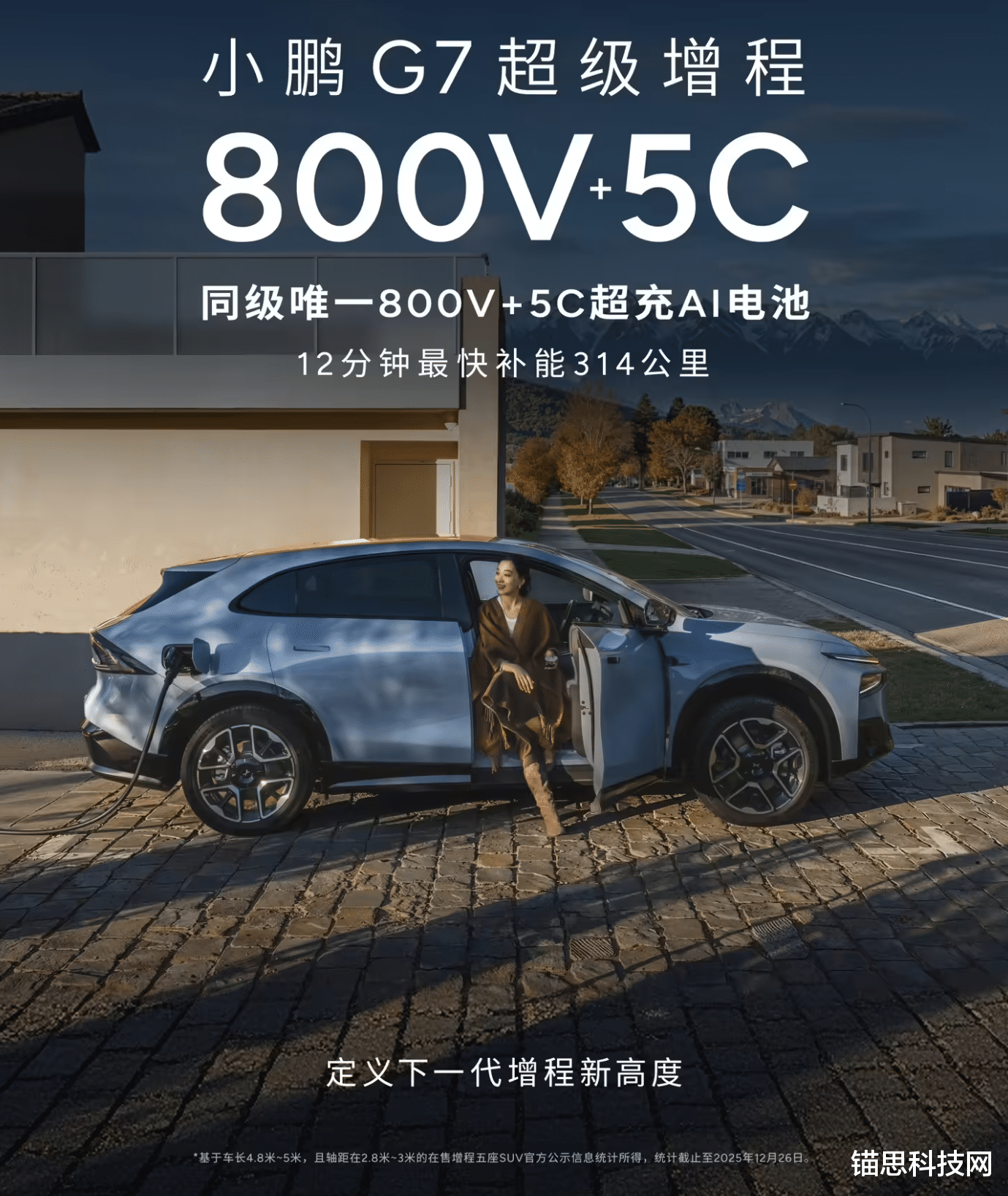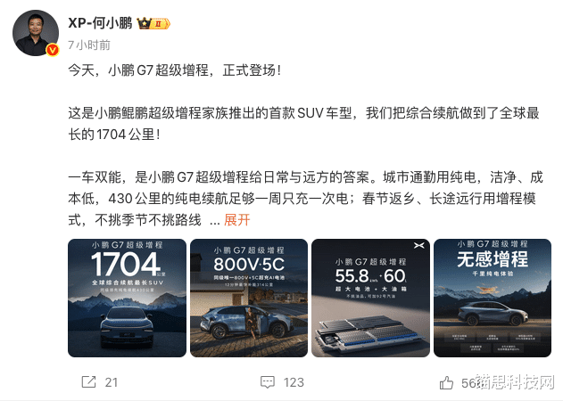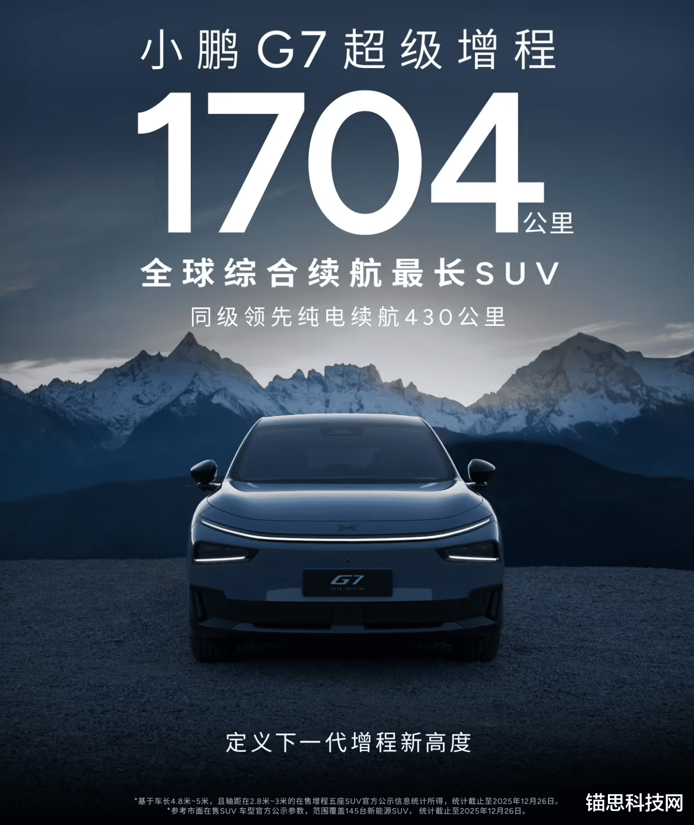 12月30日消息,小鹏汽车董事长何小鹏今日通过微博宣布,小鹏G7超级增程SUV正式登场。作为小鹏鲲鹏超级增程家族的首款SUV车型,新车最大亮点在于实现1704公里的全球最长综合续航,彻底解决用户长途出行的续航焦虑,预计将于2026年第一季度正式亮相。