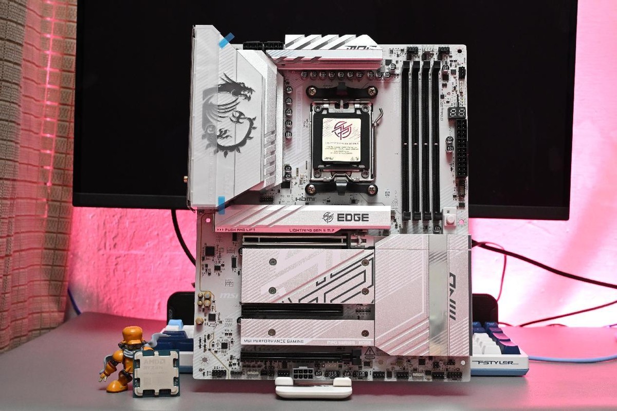 OK,为了让这颗3500买来的CPU确保正常,我把我自己目前最好的AM5平台:微星MPG B850 EDGE TI WIFI刀锋钛主板给抬了出来,为什么会选择这张主板去测试9800X3D呢,按理说随便一个主板都能带动9800X3D,这颗U功耗并不高。