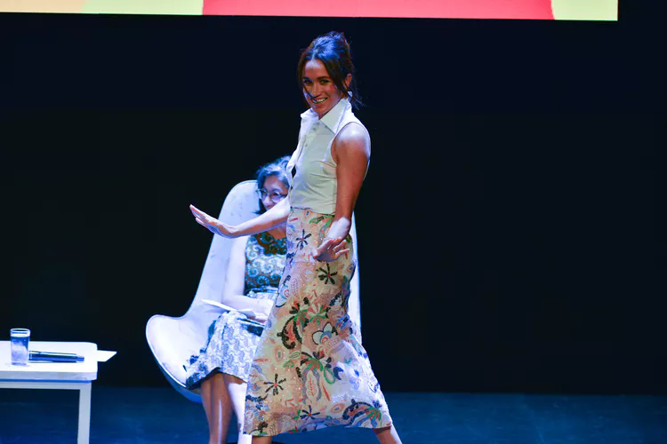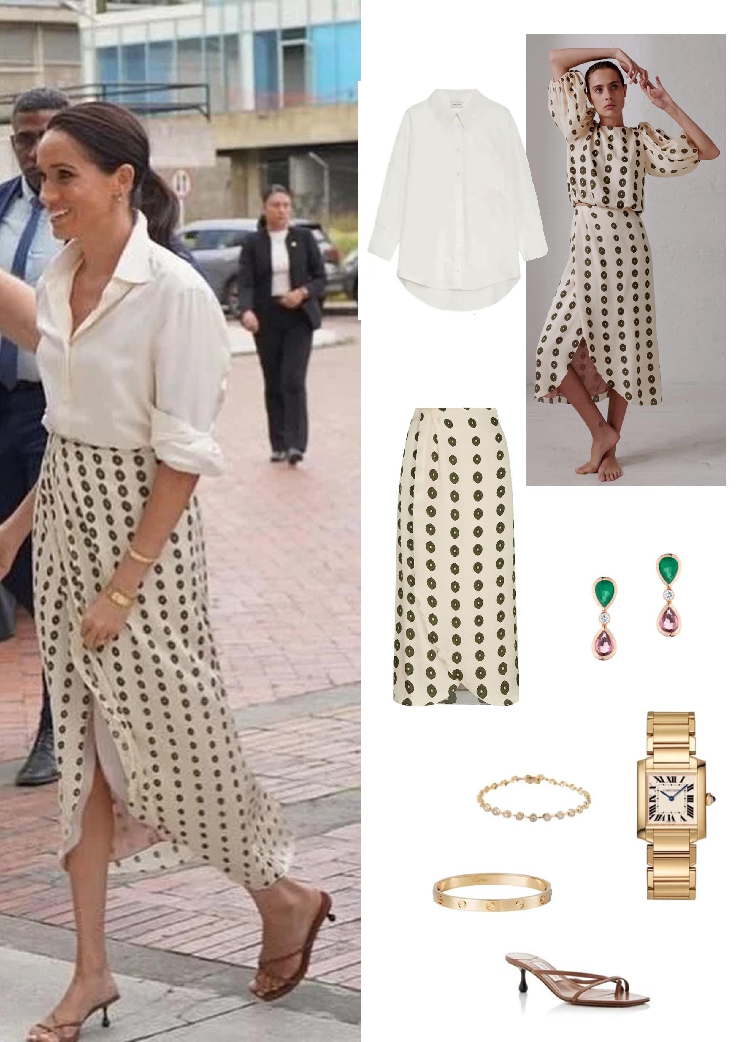 并且在哥伦比亚之行最后的一天,这位苏塞克斯公爵夫人再次穿起了哥伦比亚本土设计师品牌 Silvia Tcherassi 的设计,并搭配了Mango价值50美元的无袖纽扣纯棉衬衫,和搭配她最喜欢的鞋履Manolo Blahnik紫色高跟鞋,这是她以前穿过的旧款。