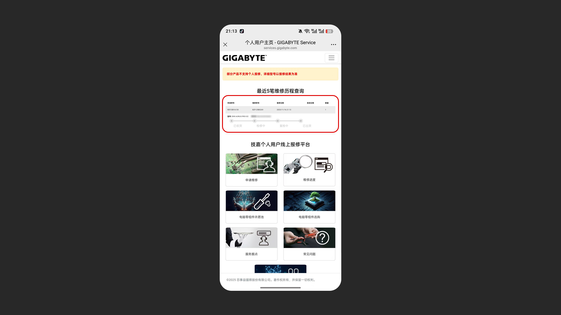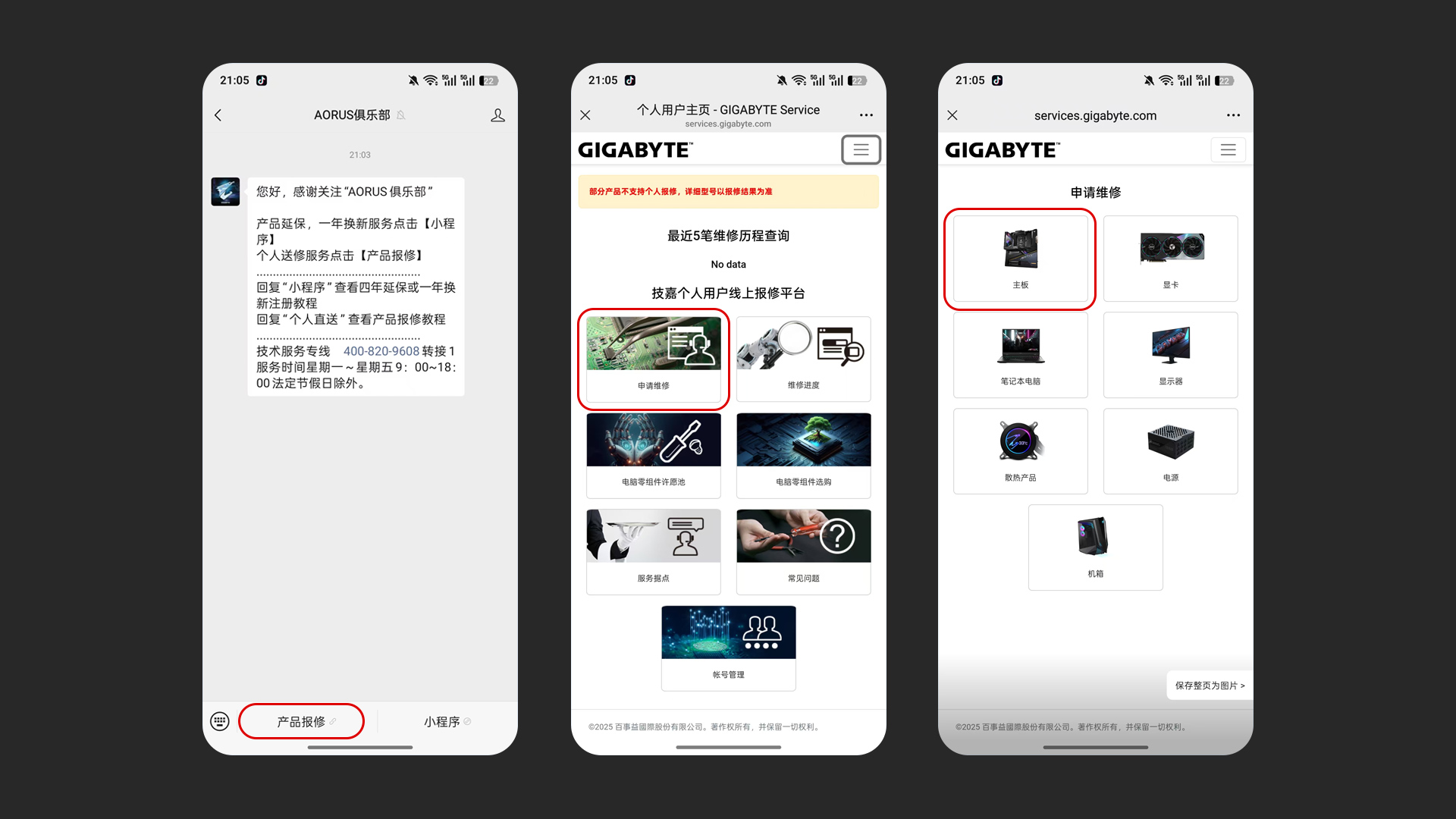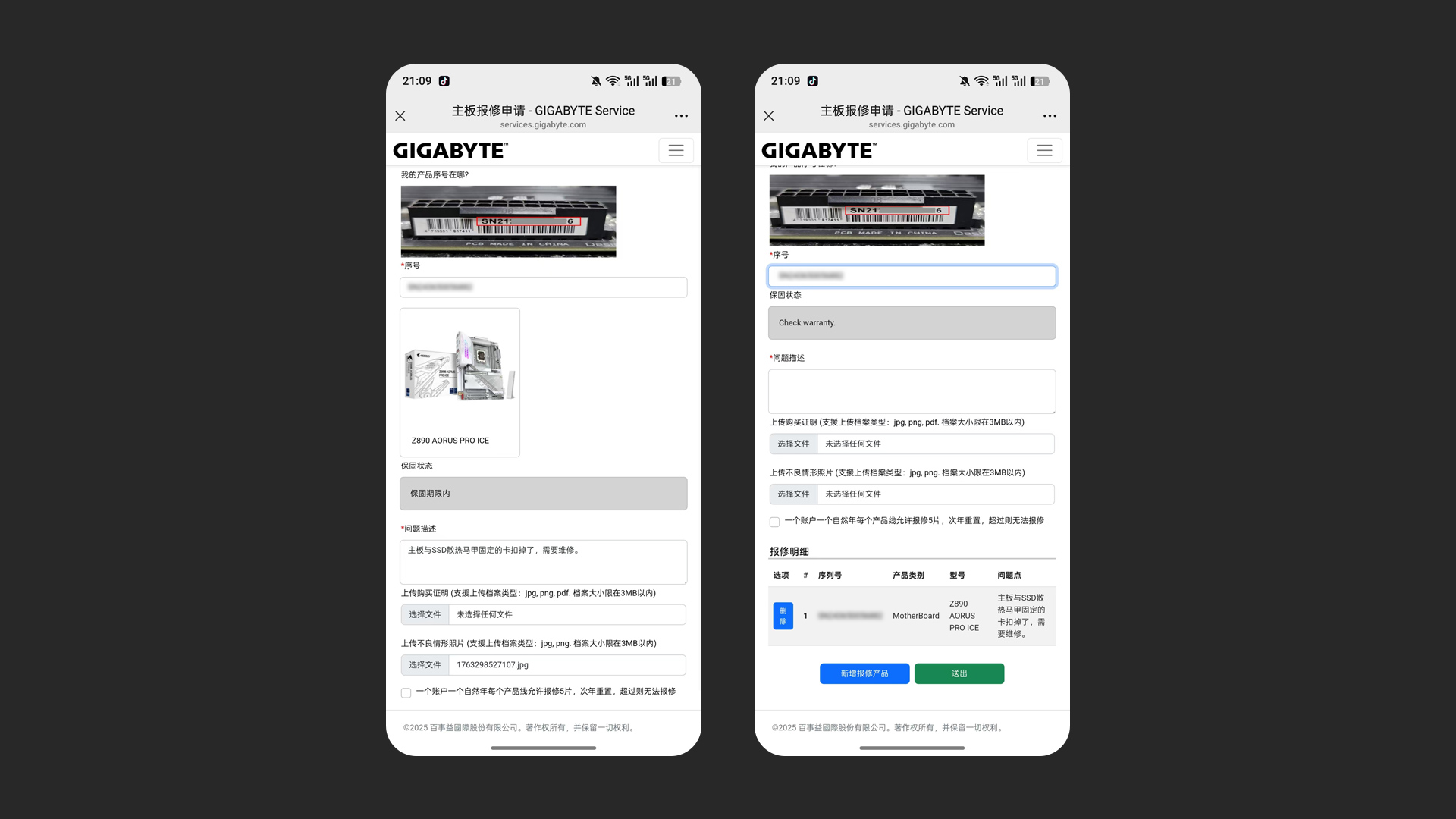 在“AORUS俱乐部”微信公众号底部选“产品报修”,跳转到技嘉售后网页。这里需要先注册一个技嘉的账户,然后选择“申请维修”,找到“主板”,在申请页面填入序列号,就会自动识别你的主板型号,给出对应的图片以及保修状态提示。