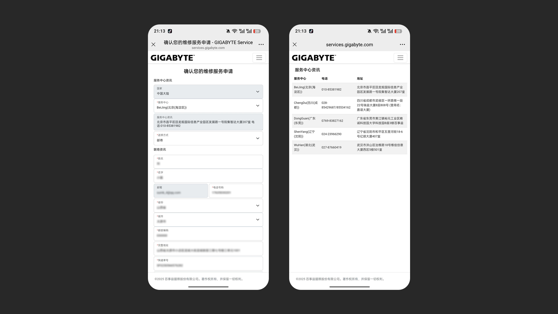 最后一步确认维修服务申请,在这一步可以选择距离你最近的技嘉售后服务中心,来回寄送可以省下一些物流的时间,在北京、四川、广东、辽宁和湖北,共有5个售后点,我在山西就选北京。需要注意的是,在下面的表格里就会让你填写寄出的快递单号,可以先在顺丰下一个快寄件单,即便快递员还没上门揽收,但会先生成单号,先填上去提交,再等快递员来拿件就行了。