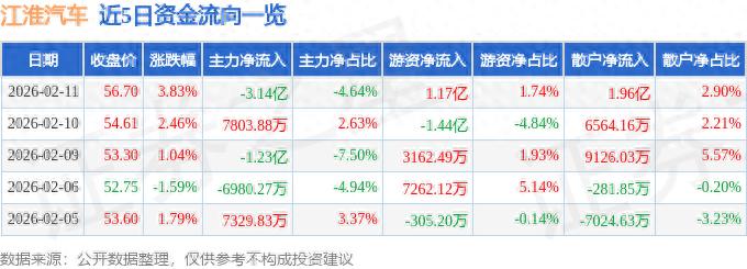 证券之星消息,截至2026年2月11日收盘,江淮汽车(600418)报收于56.7元,上涨3.83%,换手率5.42%,成交量118.35万手,成交额67.65亿元。