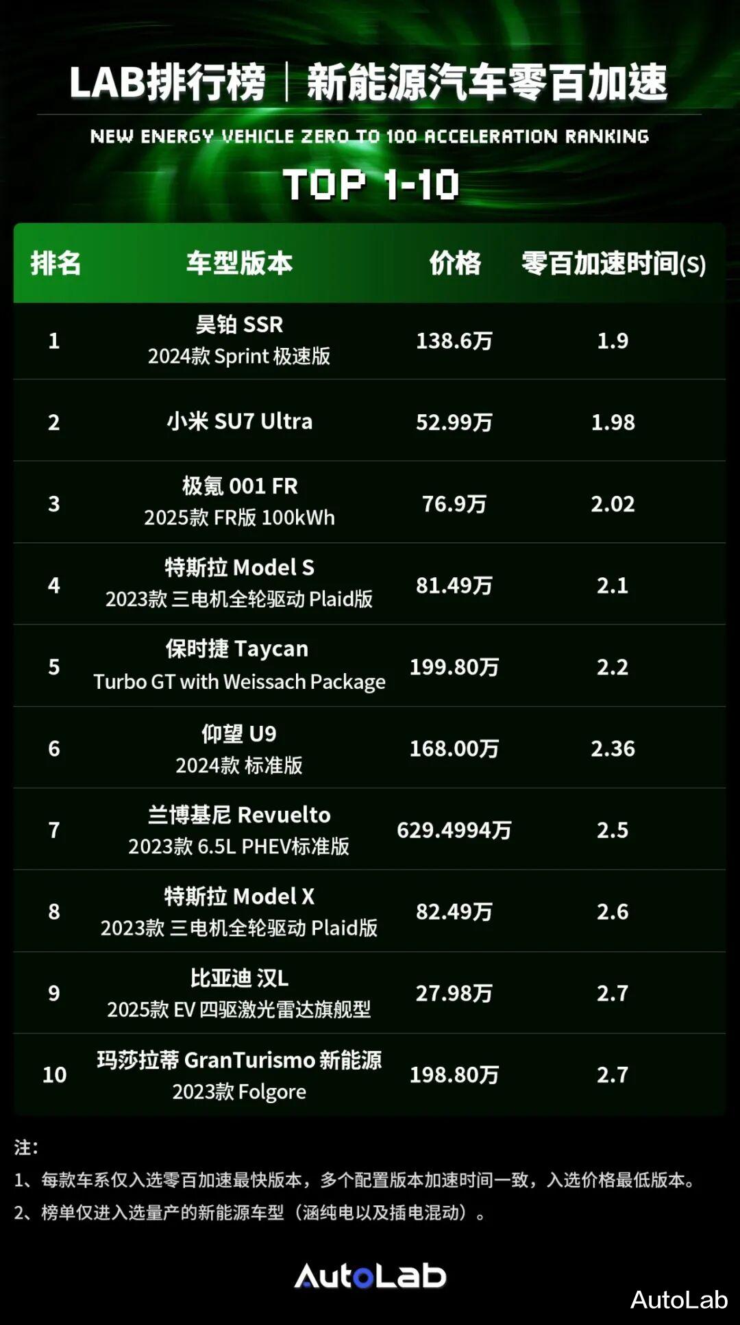 比如零百加速小于1.8s,此前我们做过一个《零百最快新能源车排行榜》,我们在这里也附上最新版。