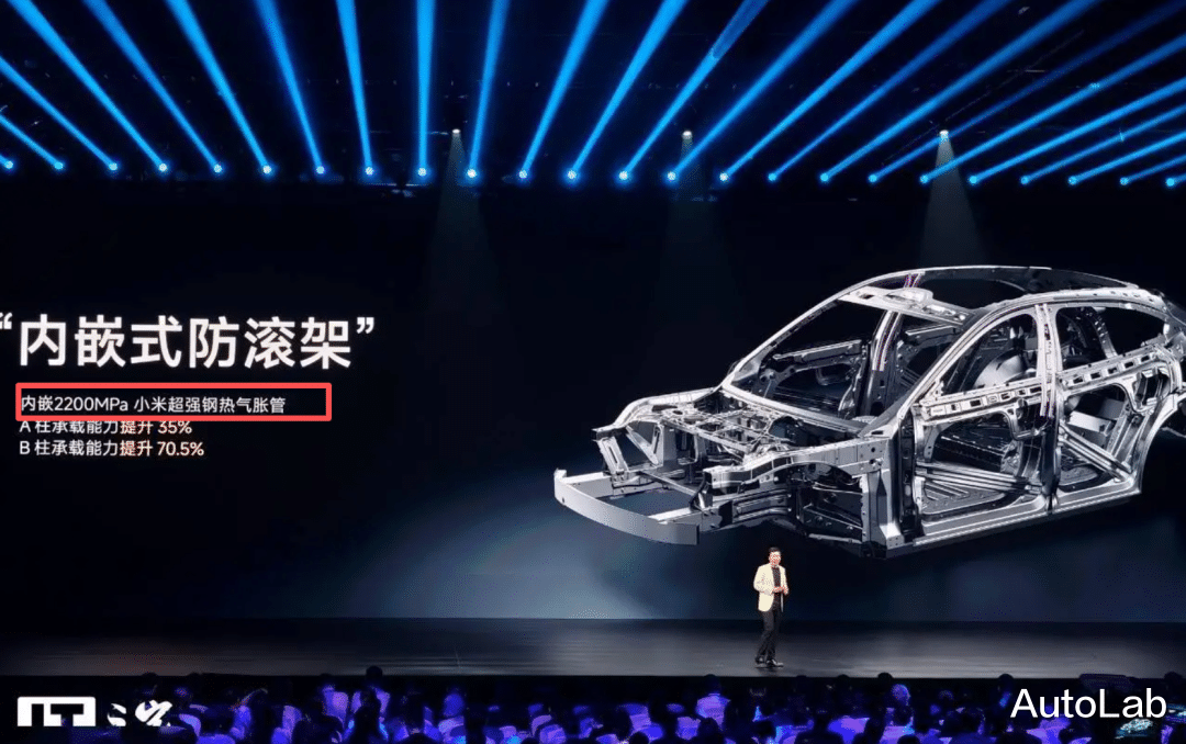 “热气胀钢”听起来陌生,实际也是热成型钢工艺的一种,优点是方便做更复杂材料造型,能在保证强度的基础上体积更小,更方便嵌入AB柱内部,小米YU7上也有这个技术,而且是2200Mpa采用热气胀工艺的超强钢。