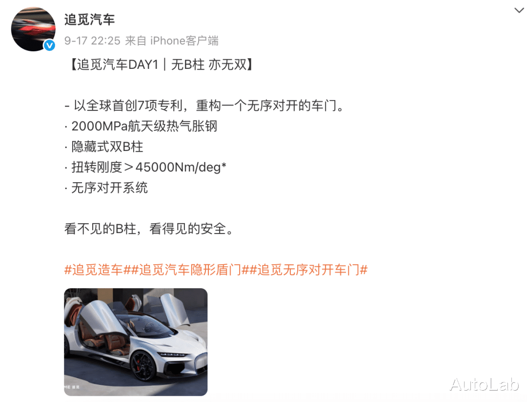 这两天追觅汽车的官方微博也开通了,陆续释放的一些产品信息还挺有意思。