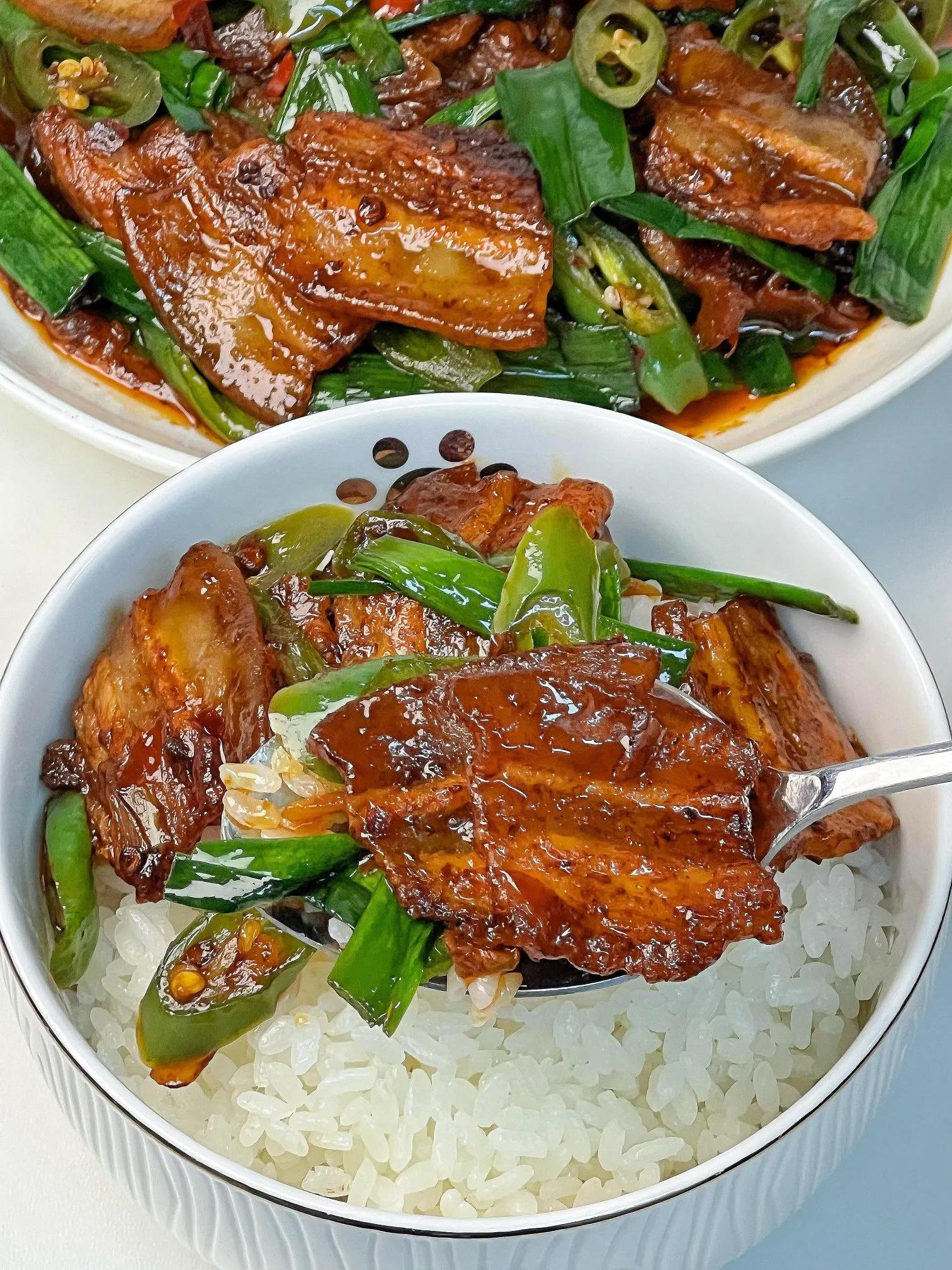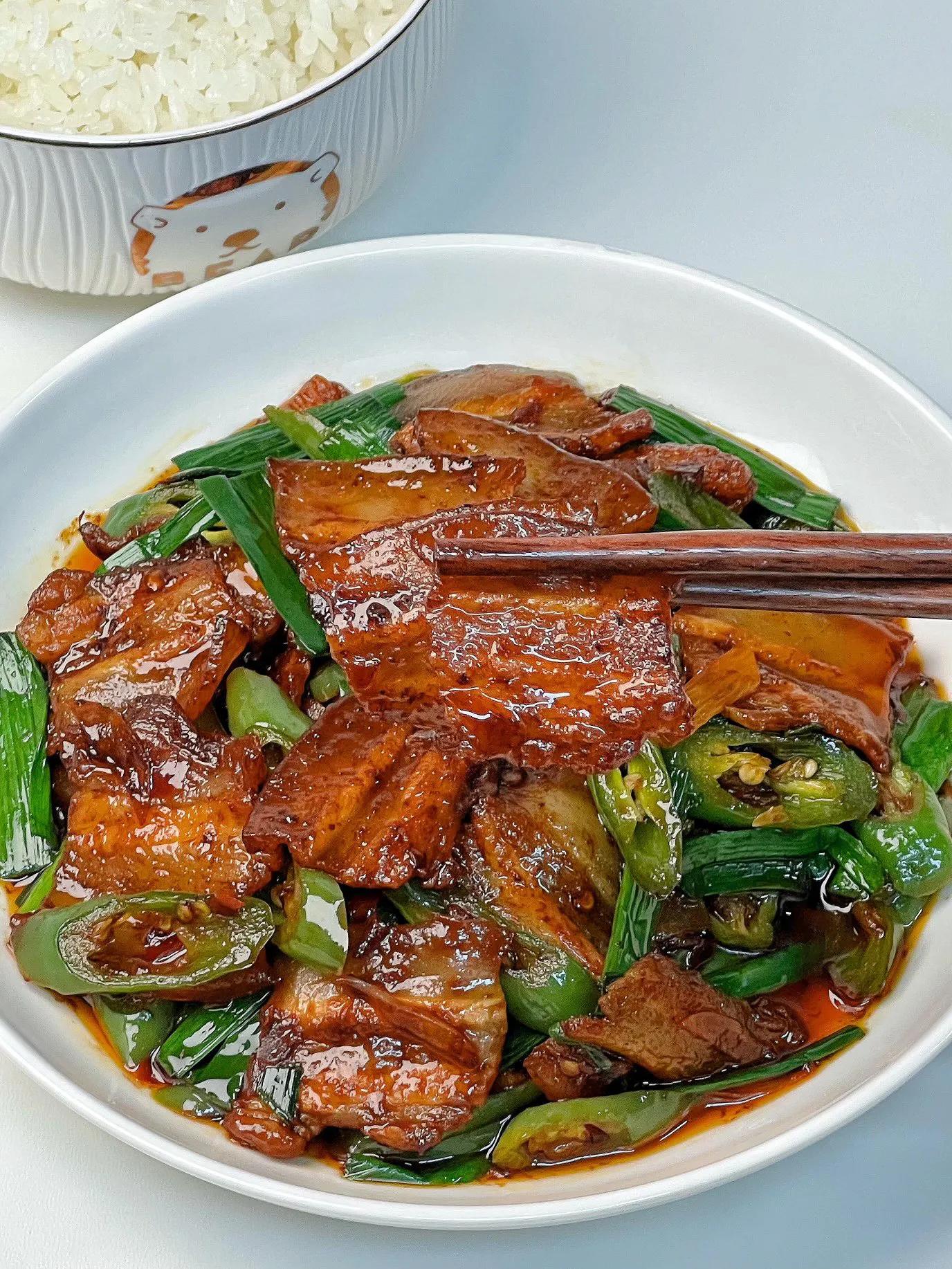 热腾腾地盛进盘里,赶紧趁热夹一筷子。肉片焦香,肥的部分已经变得弹牙,丝毫不腻,瘦的部分吸饱了汤汁,咸鲜入味。青椒爽脆,蒜苗辛香,复合的滋味在嘴里层层化开。最妙的还是那盘底的汤汁,浓稠油润,混合着豆瓣的酱香和肉的脂香,舀一勺浇在热气腾腾的白米饭上,稍微一拌,米粒油亮发光,不知不觉一碗饭就见了底。这大概就是家常菜的魅力,它不讲究摆盘,不追求稀有,只用最踏实的味道和锅气,就能带来最饱满的幸福感。答应我,一定要试试看。