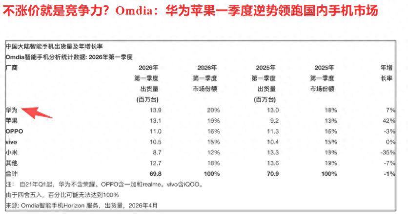 据Omdia公布的最新研报数据显示,2026年第一季度中国智能手机出货量,华为居第一,超过苹果。