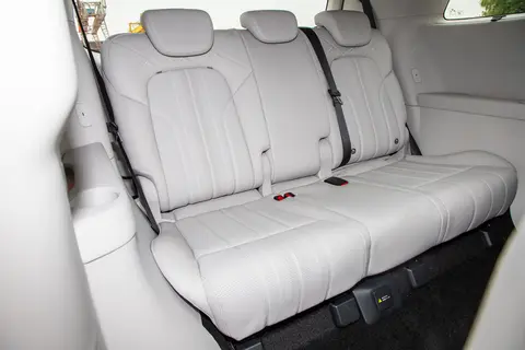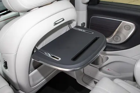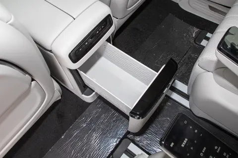 6 英寸的扶手屏操作起来很简单,后排乘客自己就能调节空调、座椅这些功能,不用麻烦前排司机。折叠桌板展开之后,临时处理个文件、签个合同都很方便,经常出差的朋友肯定会喜欢这个设计。第二排有电动遮阳帘,第三排是手动遮阳帘,夏天太阳大的时候,拉上遮阳帘,后排就不会那么晒了。第三排座椅下方还加了 220 伏电源插座,给笔记本、相机充电都很方便,就算去露营,也能给露营装备供电。