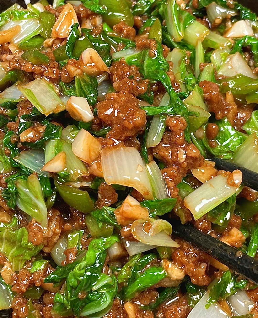 火调到中偏大,看到汤汁冒大泡就关火,余温再翻两下,菜叶油亮、肉沫服帖,盘底只剩一层“金汤”,拌饭神器上线!