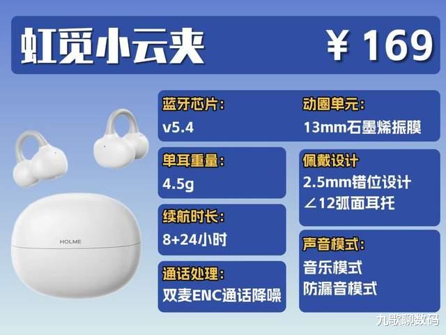 虹觅这款耳夹式耳机在百元价位里,各项性能都算不错。它有自研的防漏音模式,按一下就能减少声音外漏,不用再担心开放式耳机漏音的问题。核心配置上,用了蓝牙 5.4 芯片,连接比较稳定;还有 HBC 智慧双联功能,一副耳机能拆成两副用,可以分别连接不同的设备,分享起来方便,双麦克风 ENC 降噪也能让通话很清楚。续航和防护方面也不用太担心,耳机8+24 小时的综合续航能满足好几天的使用,防水上IPX5 级防水应对日常泼溅没问题。