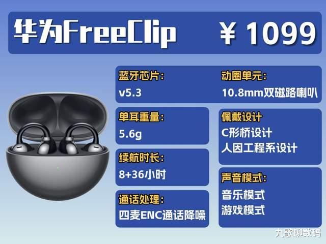 华为 FreeClip 的佩戴还挺舒服的。它是三段式设计,有舒适豆、聆听球和 C 桥,C 桥那儿带个自适应传感器,能自己调卡扣松紧。不管耳朵形状怎么样,都能贴得比较稳,不晃也不夹耳朵,适配性还可以。而且单耳才5.6g,挺轻的,戴一下午耳朵也不闷不累,基本没什么存在感。