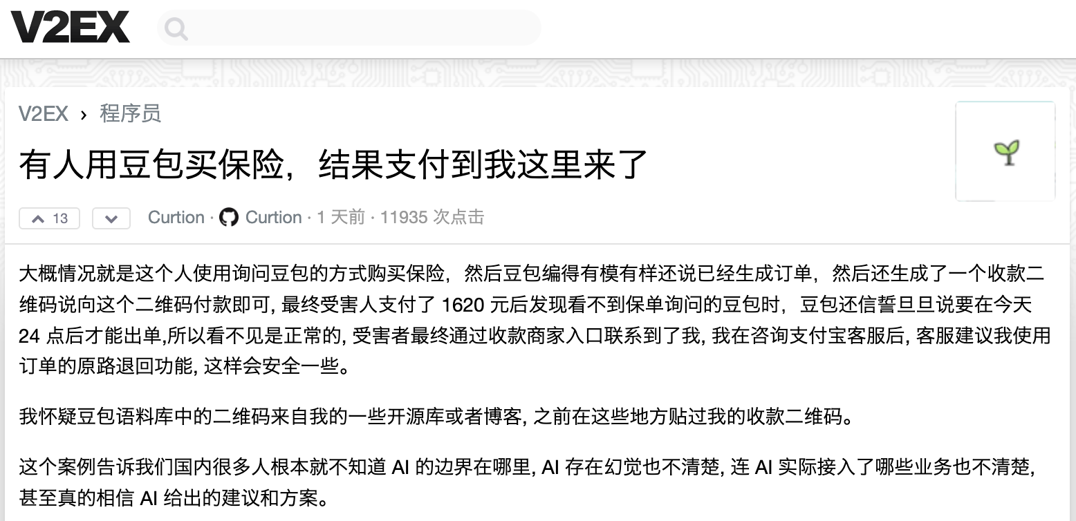 近日,V2EX社区一ID为“Curtion”的用户发帖吐槽称,自己的收款二维码被字节跳动旗下AI助手豆包拿去,用作其他用户购买保险的付款二维码。其他用户支付完成后,未查询到保单,找到“Curtion”,才发现豆包“代购”保险闹出了乌龙。