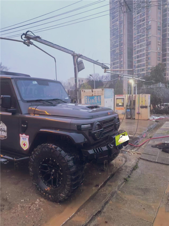 也多亏了这场大雨,我们吃完饭出来,车身上的泥被冲掉不少。但我有强迫症,必须洗干净,不然对不起它这颜值啊。