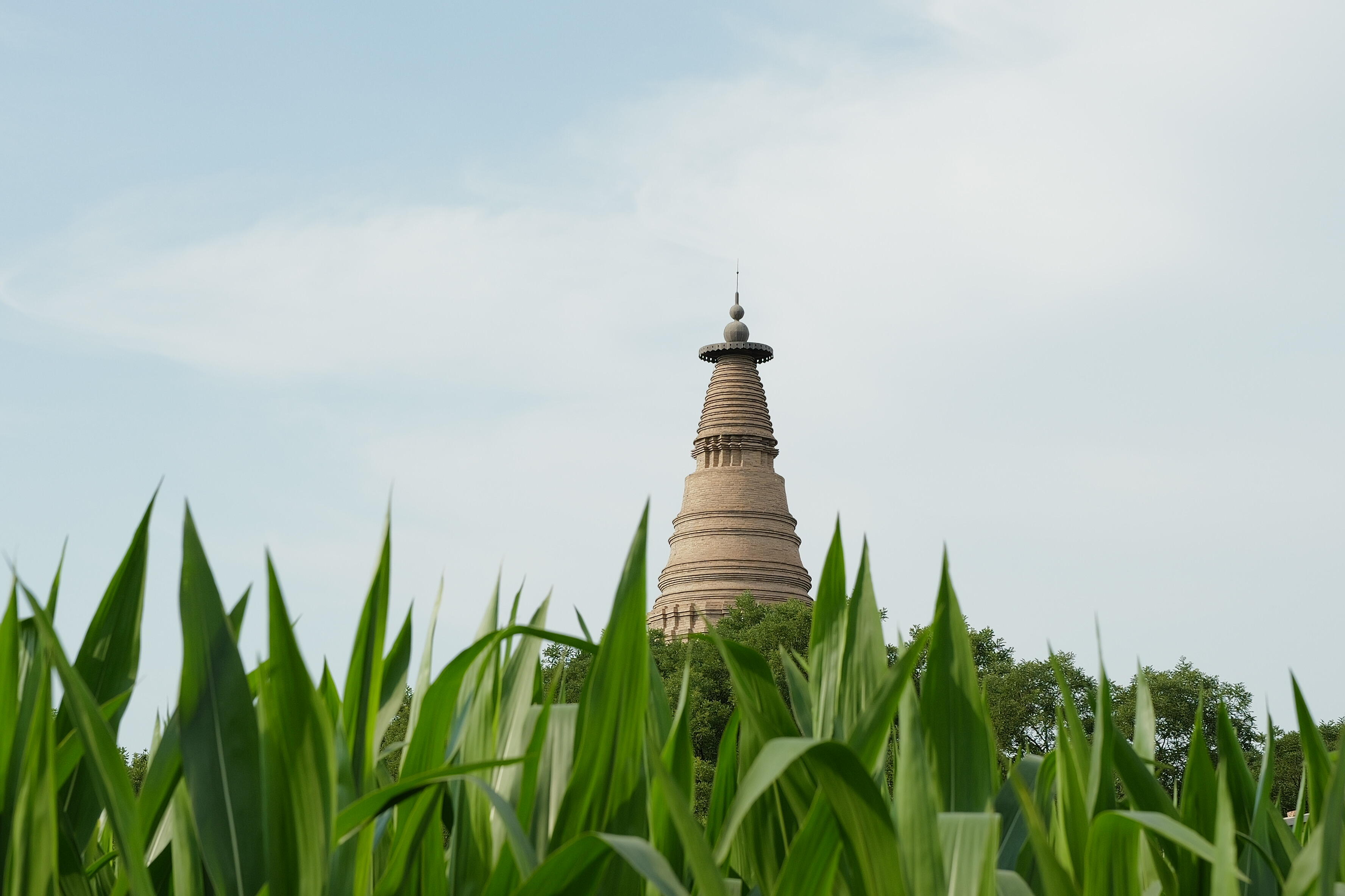 去宏佛塔的路并不好找,没有醒目的指示牌,也没有熙熙攘攘的游客。沿着乡间小路缓缓前行,两旁是成片的玉米地,玉米秆笔直地挺立着,宽大的叶子相互摩挲,发出沙沙的声响。风从远方吹来,带着泥土和青草的气息,裹挟着玉米特有的清甜。就在这片绿意盎然的包围中,宏佛塔的身影若隐若现。