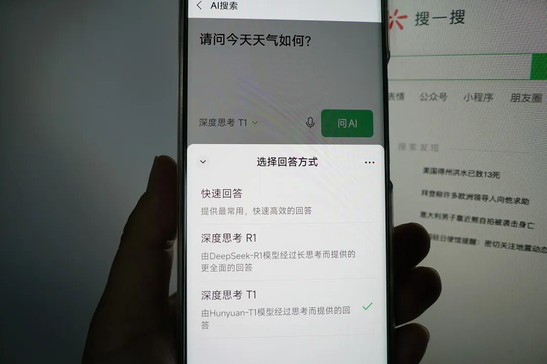 镜相工作室也注意到,微信此次测试将“深度思考”列为可选项,并提供了图片搜索的多模态功能。至于深度思考调用的模型,腾讯的回复是,“用户勾选深度思考时,默认调用DeepSeek R1模型,用户选择图片搜索时默认调用混元T1模型”。