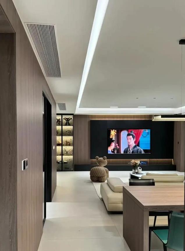 客厅是整个家居的中心,也是小雨最喜欢的地方,她选择了大气的电视背景墙,搭配灰色的沙发和岩板茶几,整个客厅显得非常宽敞明亮,层高达2.89米,而且还采用了无主灯设计,给人一种简约大方的感觉。