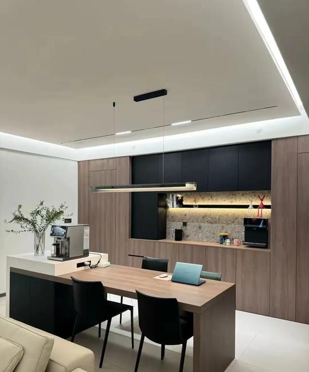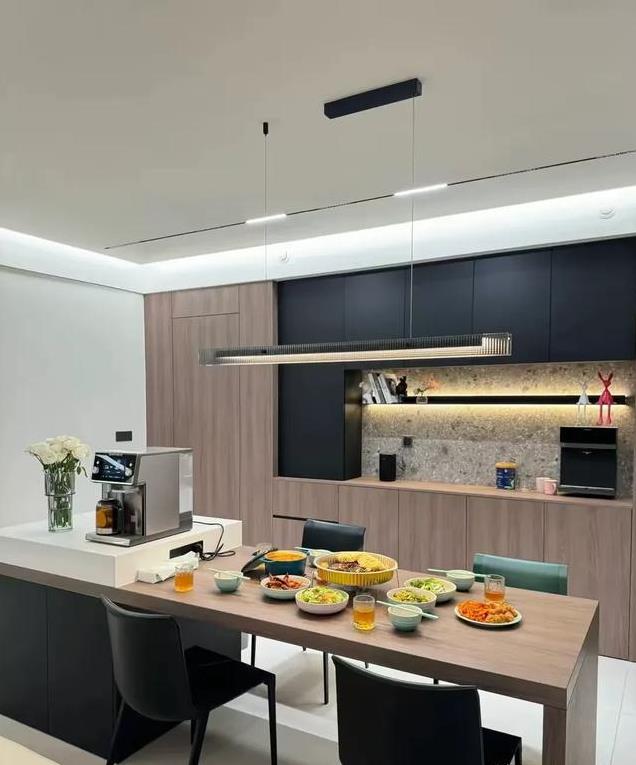 餐厅和厨房也是一大亮点,小雨将岛台和餐桌完美结合,既可以用来做饭,也可以用来吃饭,而且还设计了一个餐边柜,增加了储物空间,非常实用。