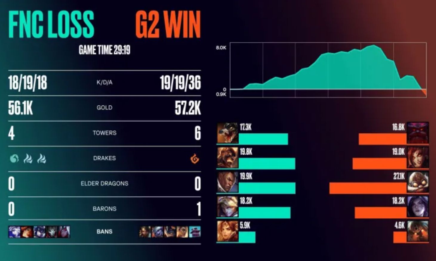 在今天决赛的最后一局比赛中,Fnatic一度在20分钟时领先了8000经济,但最终被G2找到逆转机会。在比赛进行到第22分钟时,Fnatic的Noah(伊泽瑞尔)在野区落单被抓,G2集火击杀Fnatic下路后,转到中路再击杀落单的Fnatic打野选手。在布兰德阵亡后FNC没法拼惩戒,G2直接拿下大龙,迅速缩小经济差距。