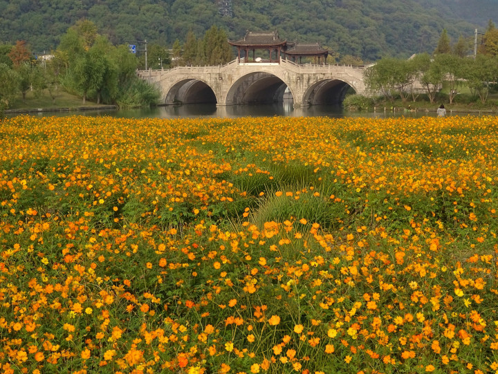 @江一:漫步湘湖花海,黄花如金,红花似火,初冬的浪漫,尽在此刻。早晨有霜冻薄冰,一日温差10℃以上,“过山车”式气温变化要注意