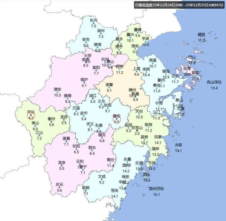 受到冷空气的影响,今天早晨浙江大部地区最低气温都有了不同程度的下降,杭州最低气温10℃,浙北地区普遍跌到了10℃以下。
