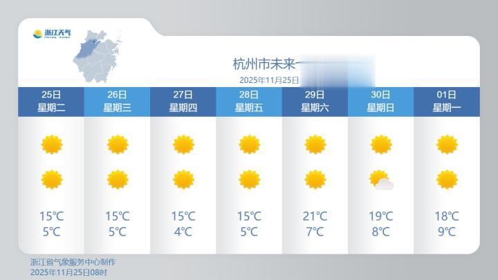 杭州市气象台称,冷空气影响后,明后几天(26-29日)早晨的最低气温较近期有所下降,最低气温平原地区2~5℃,有霜或霜冻,山区1~-2℃,有薄冰。