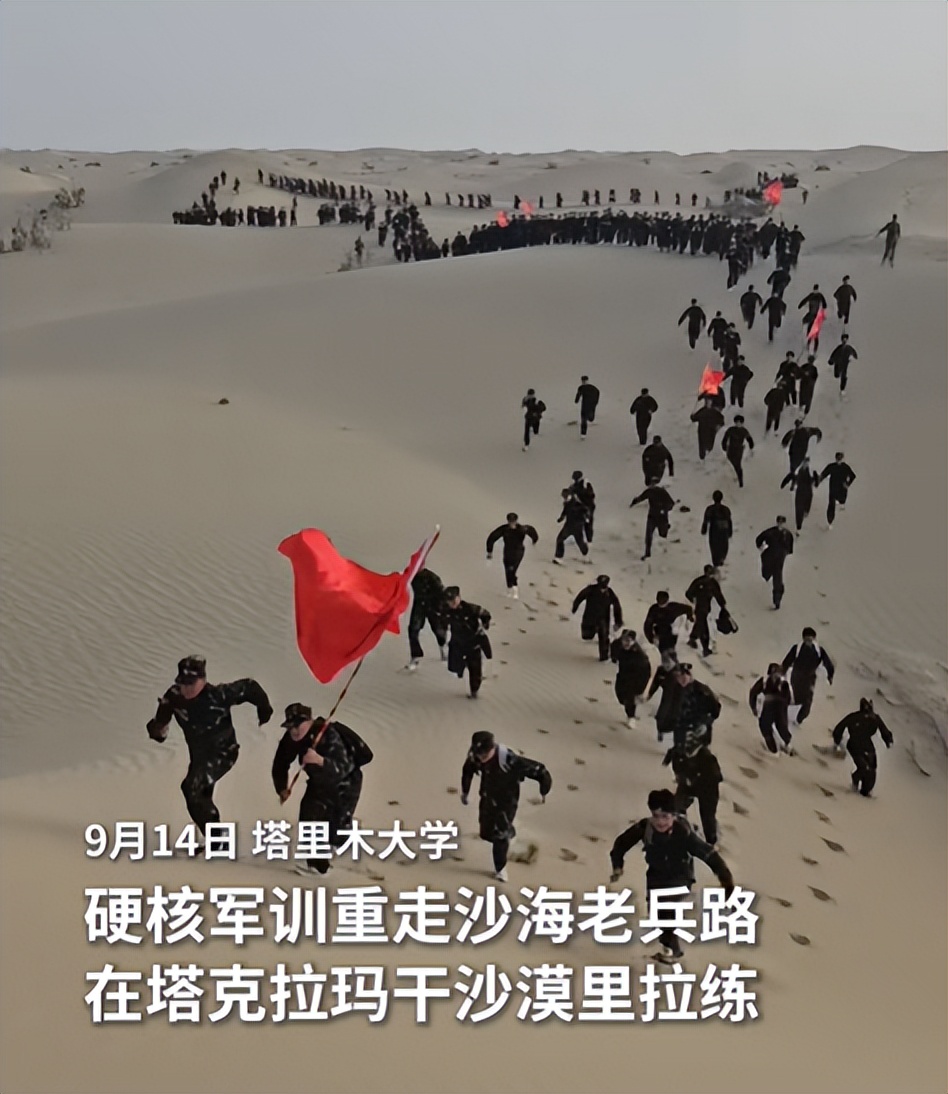 譬如,在祖国的西面,塔里木大学的同学就爆料,学校让他们去隔壁的沙漠里进行拉练,看着漫天黄沙和漫长的军训队伍,不由给人以大漠孤烟般的感悟。