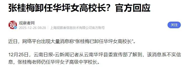 华坪县委宣传部专门回应:张桂梅仍担任华坪女高校长,卸任消息不实。