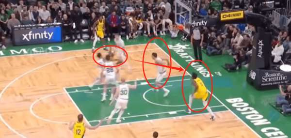 这时候绿军其实防守全乱了 只有冈萨雷斯一个人去防守